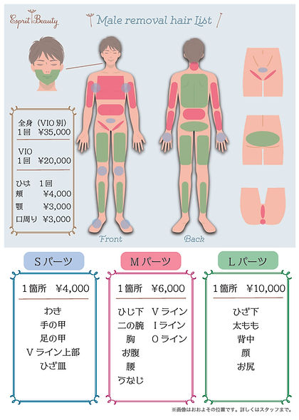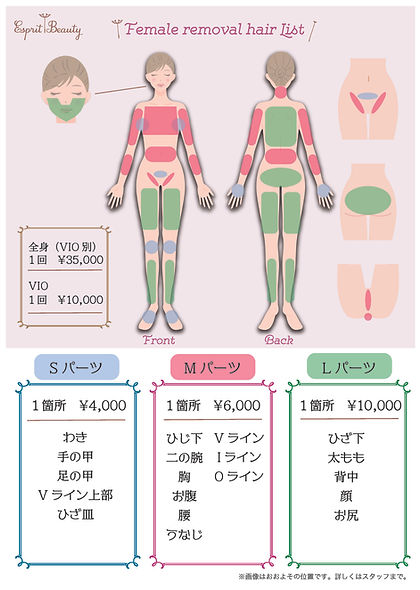 Vライン、Iライン、Oライン、ひじ下、二の腕、胸、お腹、腰、うなじ